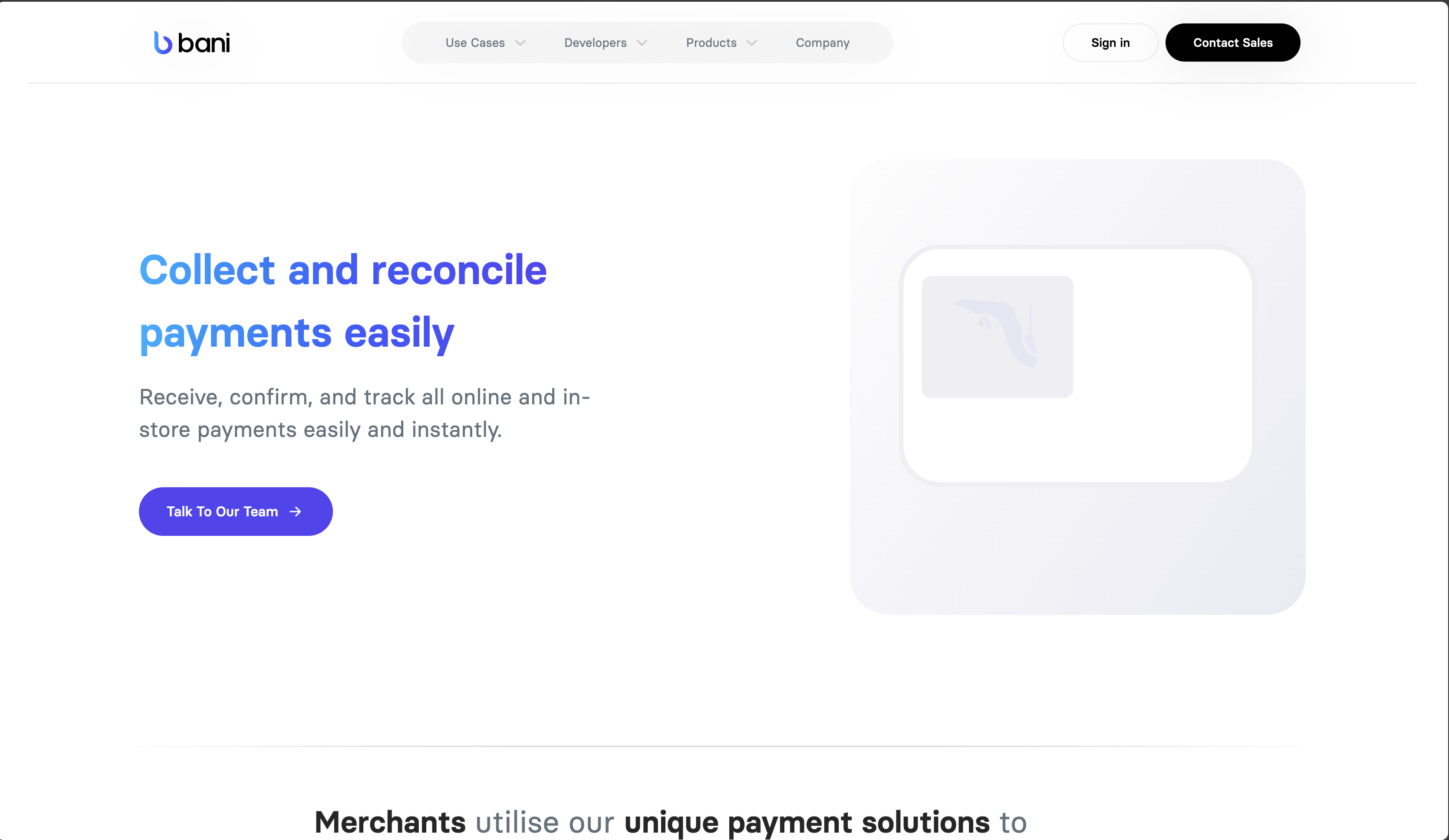 BANI lets you collect and reconcile payments easily. Receive, confirm, and track all online and in- store payments easily and instantly.